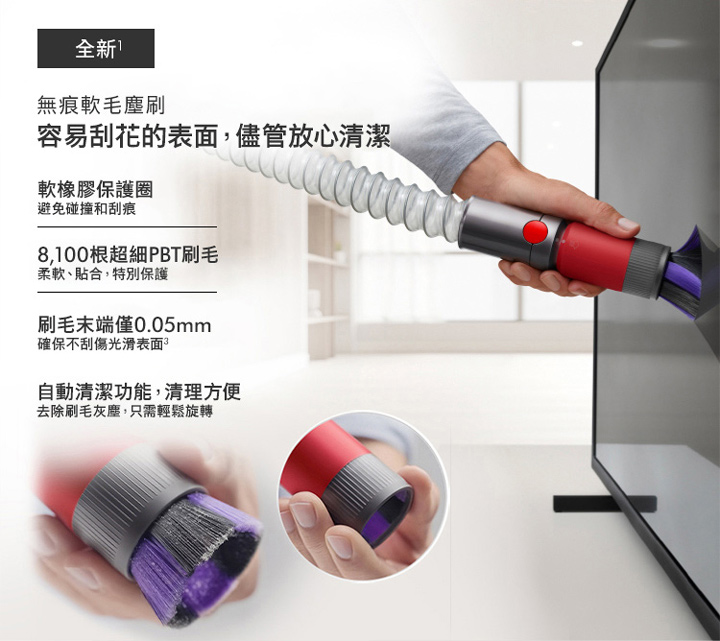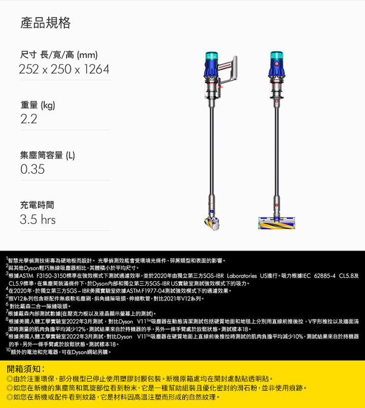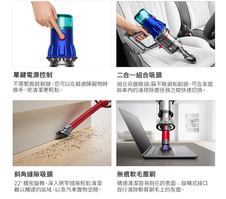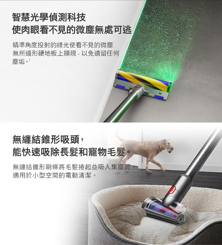內附:碳纖維毛刷深層吸頭/Fluffy Optic™ 智慧光學偵測吸頭/無纏結錐形吸頭/無痕軟毛塵刷/斜角縫隙吸頭/伸縮軟管/二合一組合吸頭/充電器/充電壁掛底座