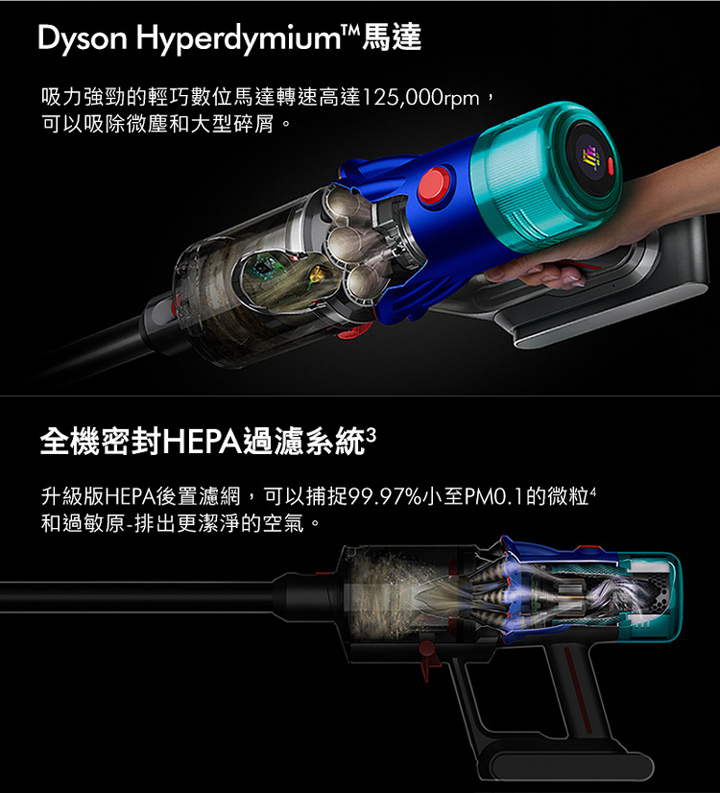 強勁的Hyperdymium馬達每分鐘轉速高達125,000轉,提供230AW強勁吸力