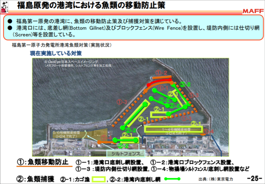 在福島核電臨海港灣內裡採樣的魚,儘管有用刺網盡量補殺(上圖),但被污染的海水,和灣外的大海是流通的。前國會議員山本太郎曾在電視上表示,港灣內的水,一天會被灣外的水替換掉47.3%(見首圖),8天後會被替換掉99%。因此,即便是港灣外,仍可能有污染的漏網之魚;他說:「請務必要檢查放射性鍶。」