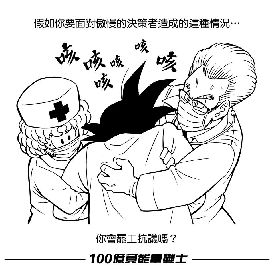 在臉書粉絲專頁「100億負能量戰士」中,本來是對龍珠漫畫的二次創作,挖苦上班族對老闆們的憤恨。隨著去年反送中運動升溫,不少二次創作的作品愈見以運動的聲討對象―警察及特首―為題材,到了新冠狀病毒成為香港人共同面對的問題時,該專頁也製作呼籲人戴口罩、遵從醫護人員建議等的相關作品。