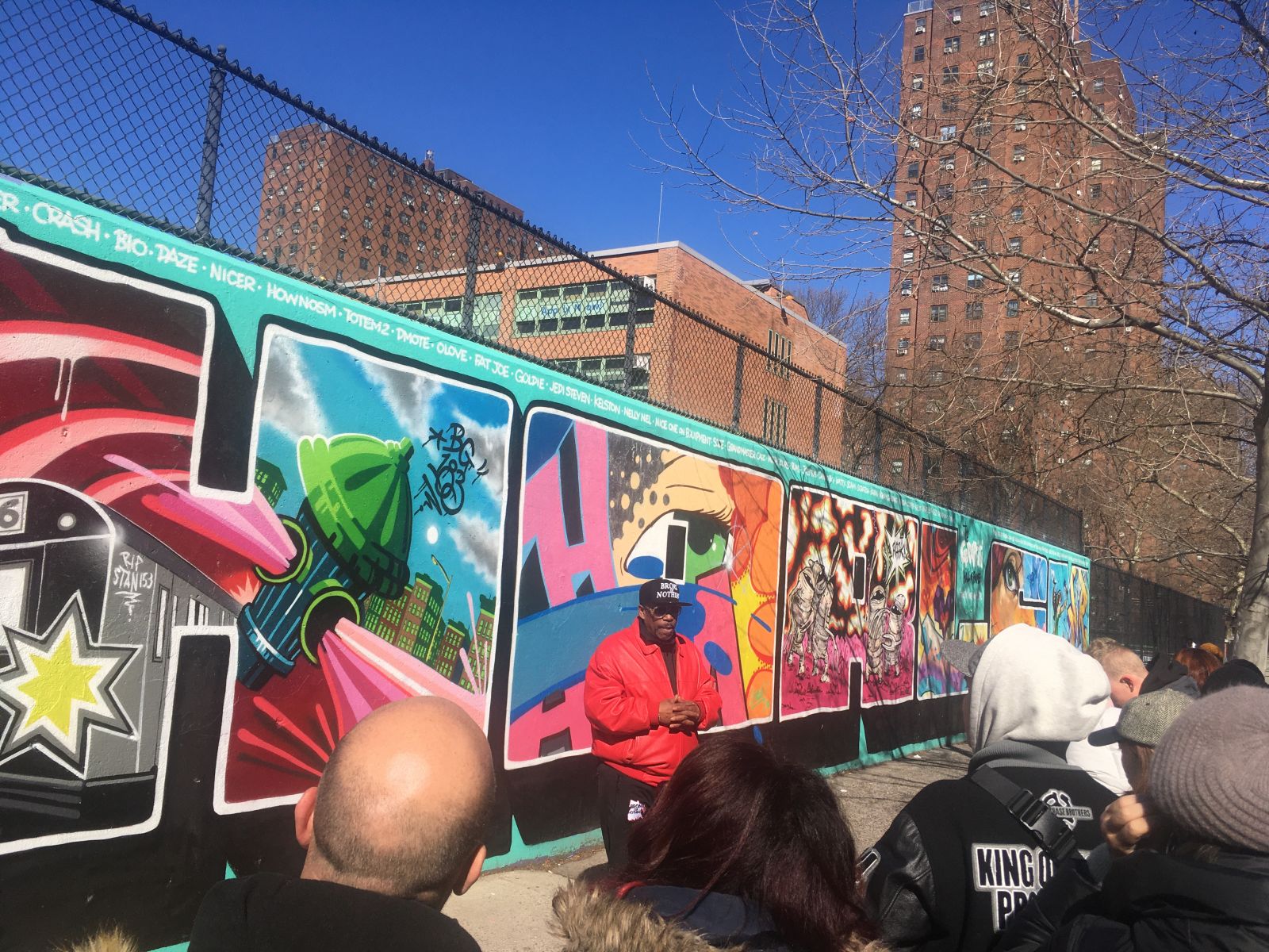 下一站來到所謂的西班牙哈林區中,下車參觀第106街一間學校操場上布滿塗鴉的牆壁,Caz解釋這個噴漆空間歷史可追溯到80年代,被稱為「塗鴉名人堂」,只有能力被認可的噴漆高手才能在此留下其作品。我們接著驅車進入哈林區中心,沿路聽著Caz配合街景講著嘻哈早年的軼事。哈林區是紐約市的中心地點,來自布朗克斯、布魯克林、皇后區的青少年若要集結、參加大型派對,都會來到哈林區,也促成了知名夜店Harlem World的出現。我們看到了Harlem World和最早的嘻哈唱片公司之一的Enjoy Records舊址,現在皆已化成商場,又下車參訪了仍充滿表演能量的Apollo Theater。除此之外,Caz還介紹了專門招待別處不受歡迎的黑人名人的Hotel Theresa、最早的黑人報社Amsterdam News、Malcolm X的清真寺Masjid Malcolm Shabazz、出現在電影New Jack City中的Graham Court公寓。這趟哈林區的行程牽涉到的已不只是嘻哈歷史,而是一部美國黑人歷史。