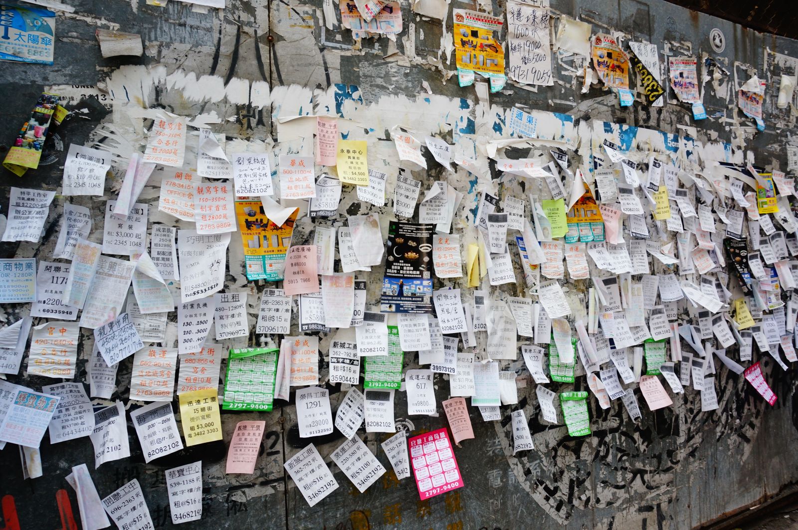 九龍半島上工業大廈聚集區附近貼滿租賃廣告的水泥牆。遇見這堵牆的那天,正和幾位農夫朋友在某棟工業大廈中的皮雕工作室擺攤。(拍攝:筆者)