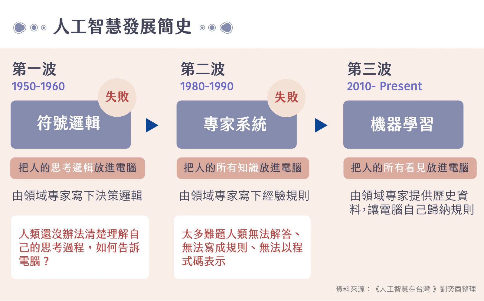 前兩波人工智慧(AI)希望電腦能像人一樣思考,但皆失敗。2010 年至今的 AI 熱潮由「 機器學習」領銜,簡單來說就是我們提供大量資料,讓電腦自己找出事件之間的關聯規則,學會判斷,在許多領域都已比人類預測得更精準。