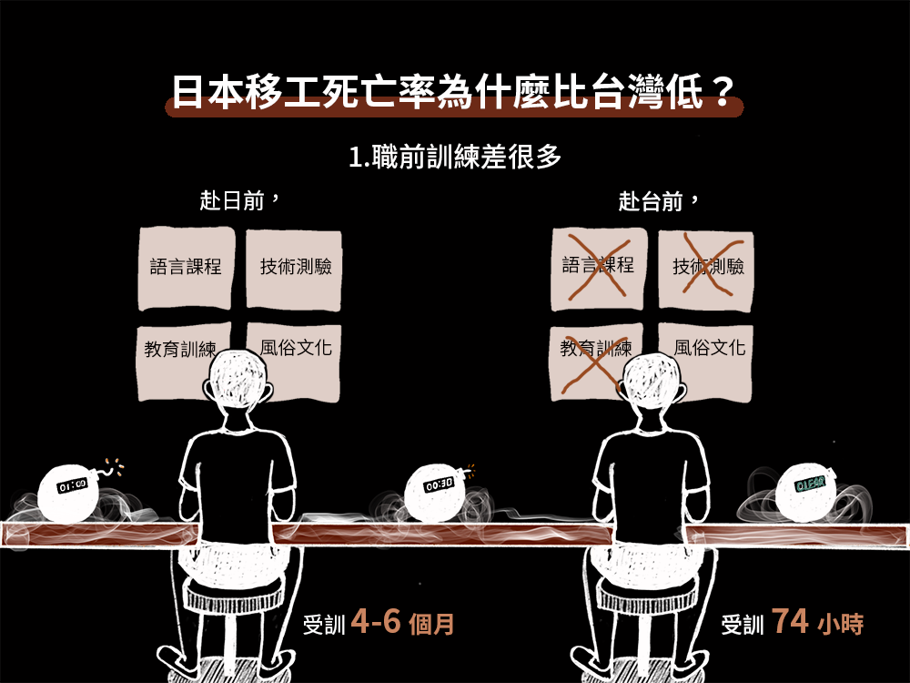 反觀台灣針對移工入國前沒有嚴格要求,只需完成台灣風俗文化、交通工具使用,以及勞動紀律等74小時的課程即可。因此,移工在語言不通以及缺乏操作機台的職前訓練下,更容易遭遇職業災害。