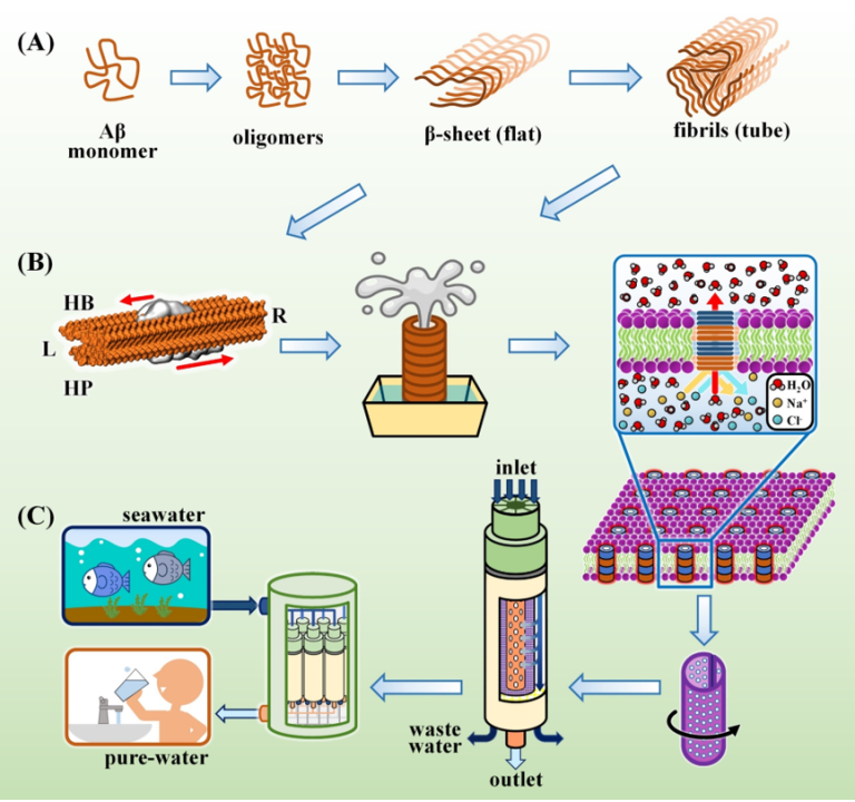 許世宜解釋,透過將類澱粉蛋白組成奈米微管,並分別堆疊親水性與疏水性胺基酸,構成棘狀位能(ratchet potential),可以推動水分子往單一方向移動,同時阻擋水中的氯、鈉離子等鹽分,只產出純水。