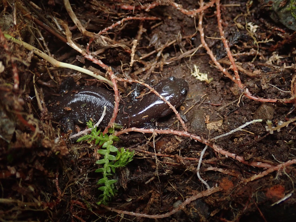 棲身於草根之間的觀霧山椒魚。圖片來源:雪霸國家公園管理處提供