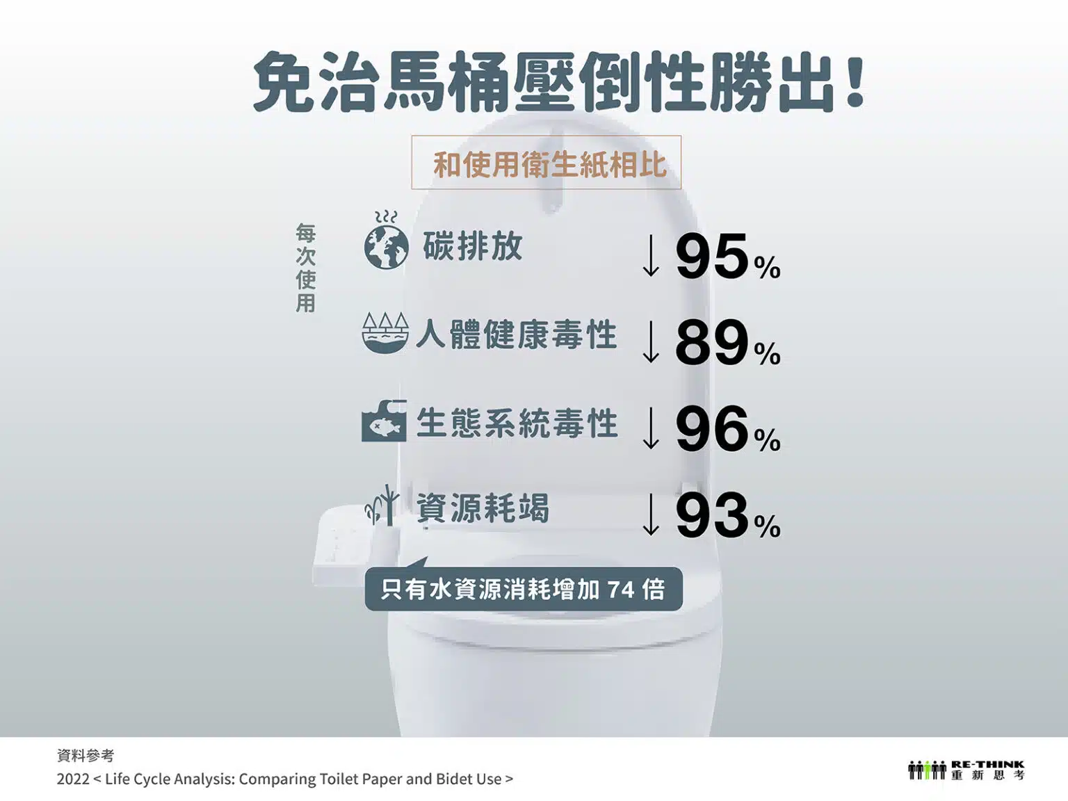 以下,再從四大面向評比,發現免治馬桶清洗相對衛生紙擦乾淨,碳排放減少95%;人體健康毒性減少89%;生態系統毒性減少96%;資源耗竭減少93%。