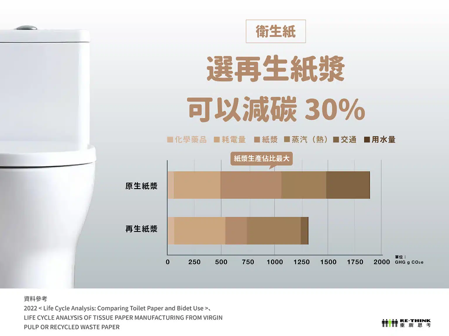 改用再生材質衛生紙 : 因為紙漿製造佔了衛生紙大多數環境影響,如果改用再生紙漿可減碳約30%,也就減少製造階段對環境產生的消耗。