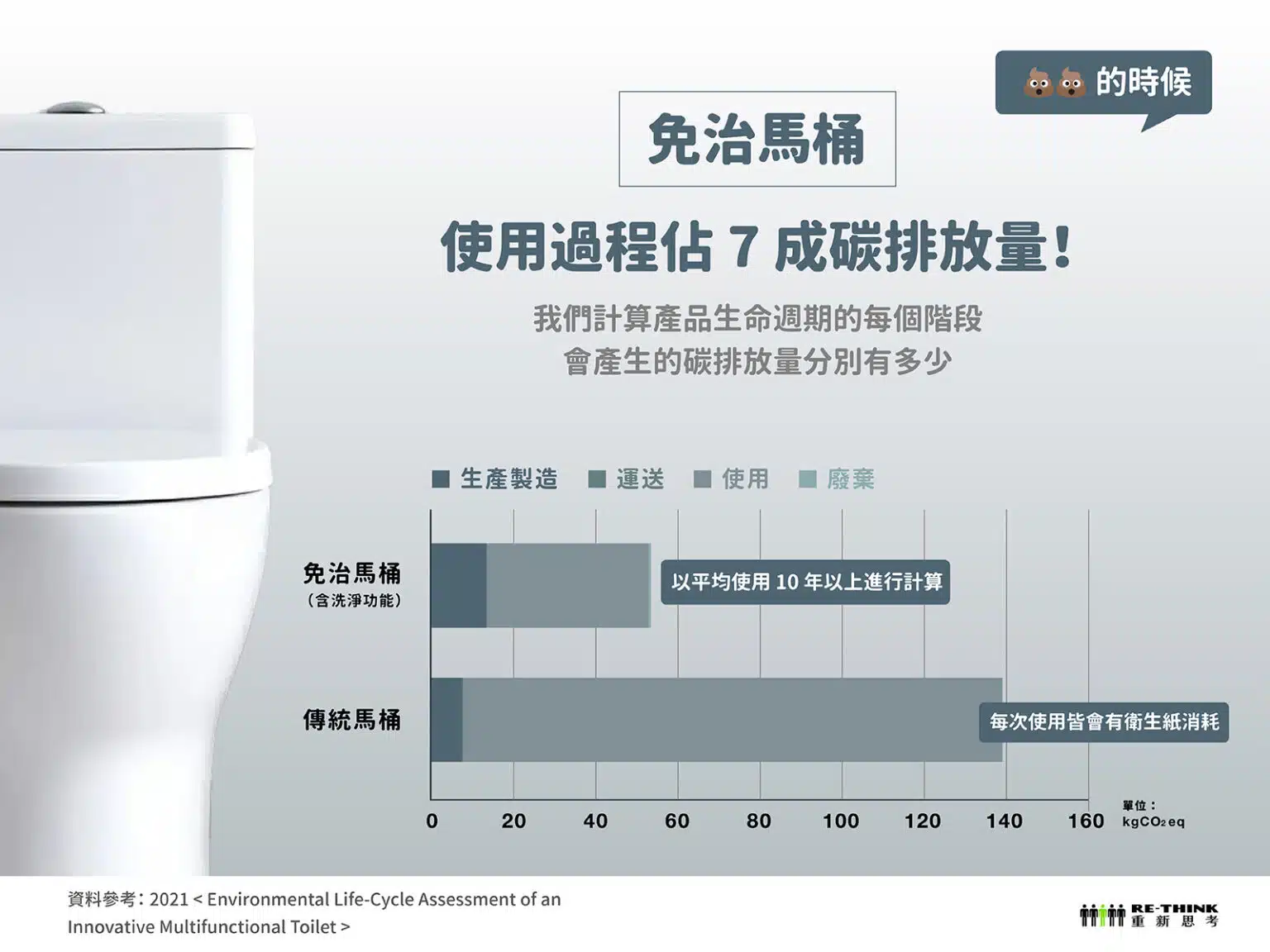進一步計算產品生命週期的每個階段,發現免治馬桶在使用階段產生的環境影響最大,約佔70%,其次為材料生產及產品製作,約佔30%。相較之下,傳統馬桶每次上完後,都會有衛生紙消耗;若是習慣沖洗屁屁,免治馬桶已經是用水量更小的清洗方式,若額外淋浴沖洗,反而浪費更多水量!