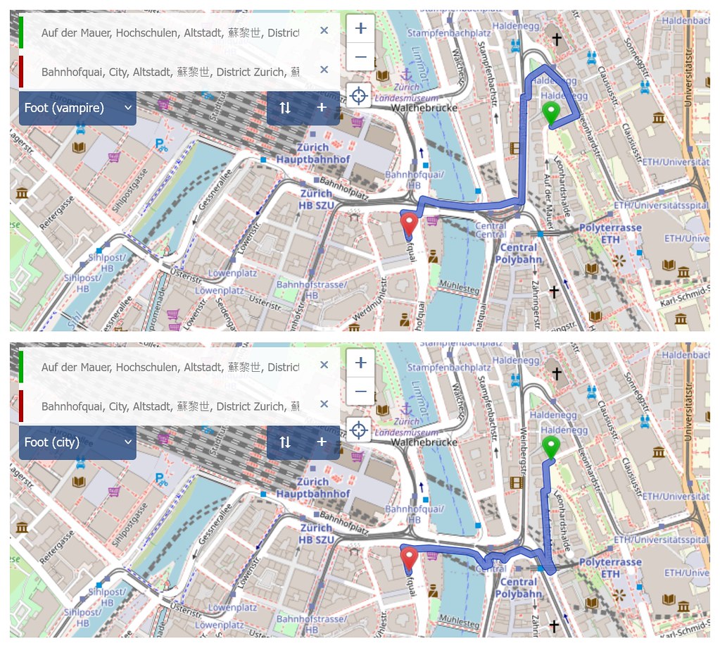 瑞士開放街區圖提供的路徑選擇。上圖為吸血鬼模式,距離可能遠一點,卻能減少日照。下圖為一般步行模式。截圖自https://routing.osm.ch