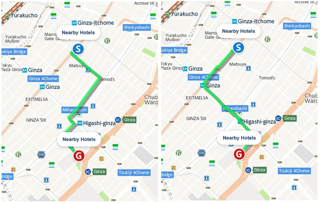 地下道複雜,卻不失為避雨的好選擇。左圖:最佳模式。右圖:避雨模式。截圖自https://japantravel.navitime.com