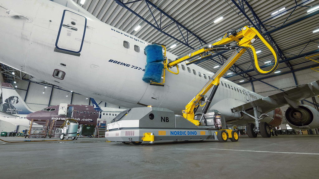 為減少洗飛機的耗水量、人力、時間,近年航空界紛紛採用自動化設備。瑞典公司Nordic Dino就是一家洗飛機機器人的製造公司。
