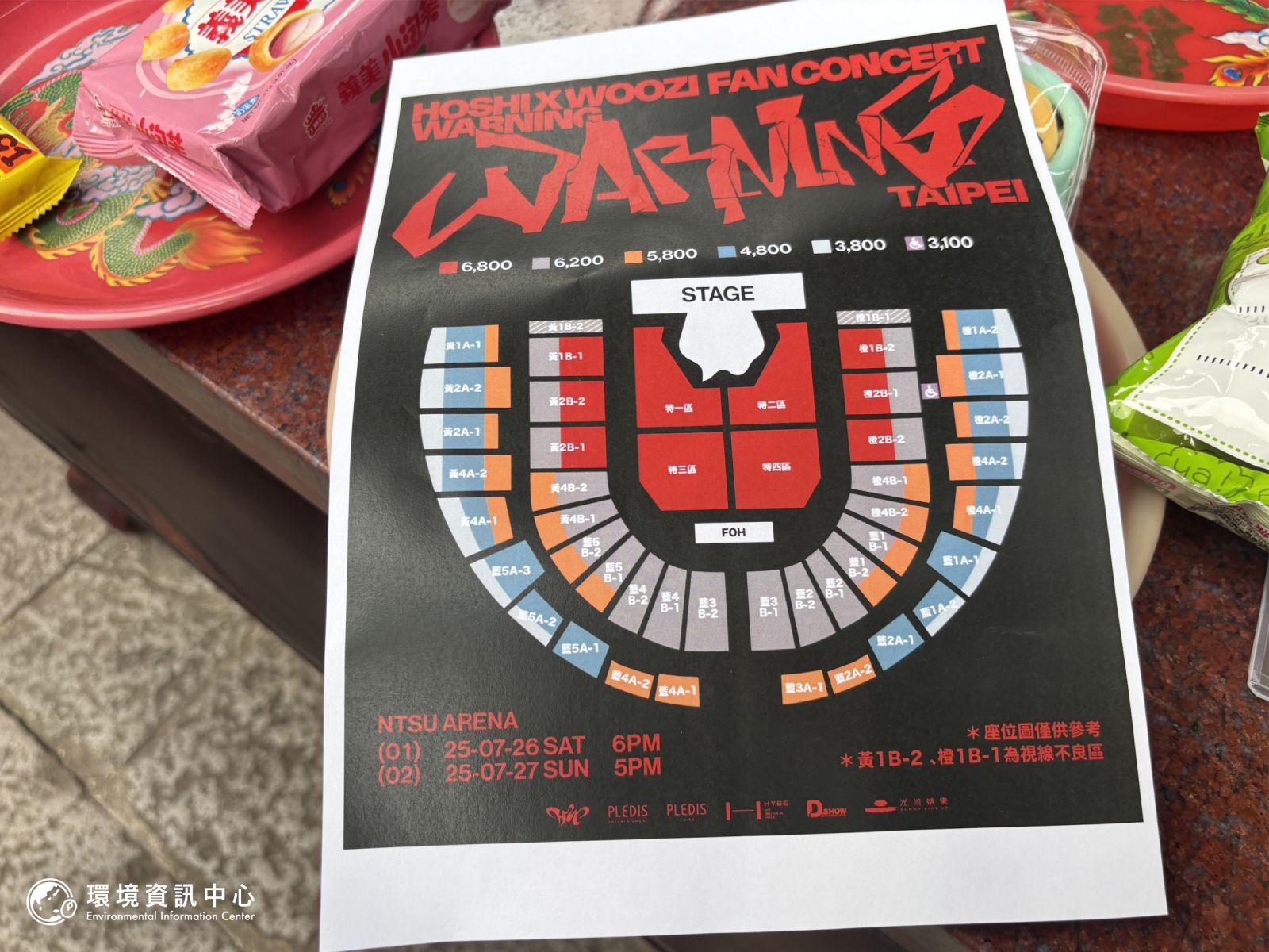 案桌上有乖乖、甜點、肯德基蛋塔,還有擺放整齊的演唱會座位圖、偶像的照片,這是年輕世代的祈願方式。