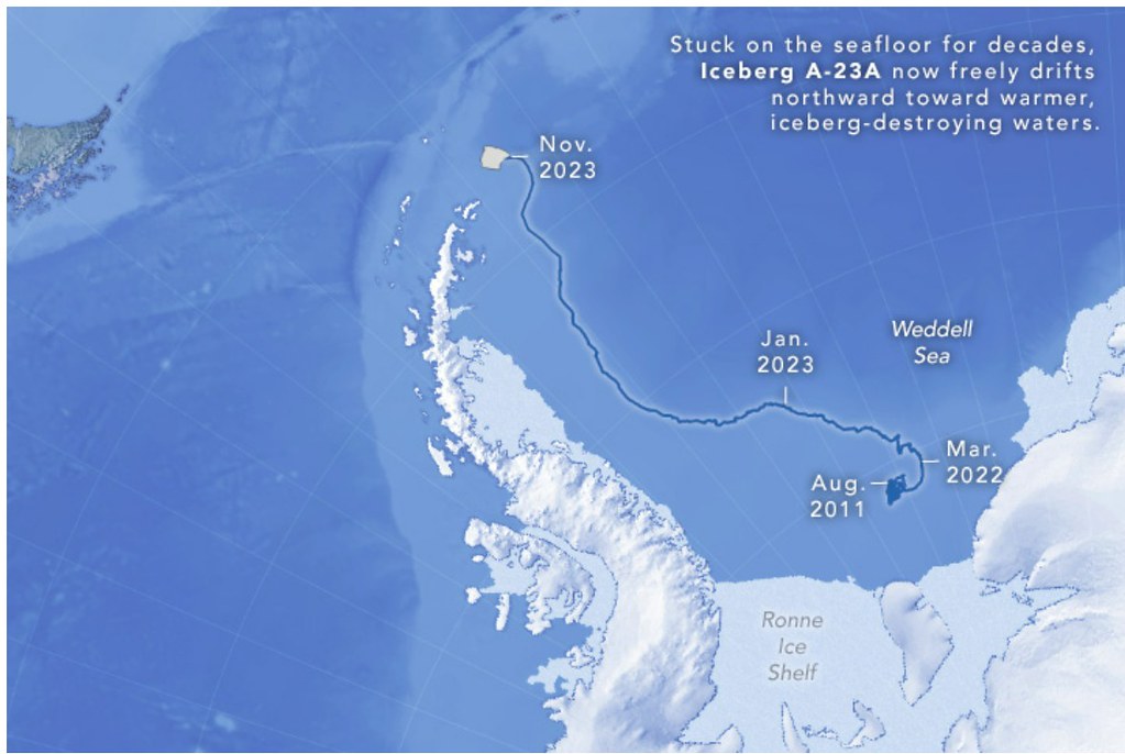 A23a形成不久就卡在南冰洋的威德爾海(Weddell Sea)海床,在長達30多年的時間裡緩慢融化。在風與洋流的衝擊下,一些冰塊崩落入海。大約2020年,A23a掙脫束縛,展開海上漂流之旅。
