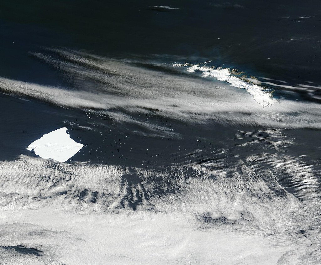 A23a在冰棚崩落近30年後,展開往北漂移的旅程。圖片來源:NASA