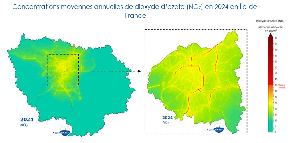 2024年大巴黎地區的平均二氧化氮濃度,市區和主要幹道旁的居民仍須面臨空污影響。照片來源:Airparif
