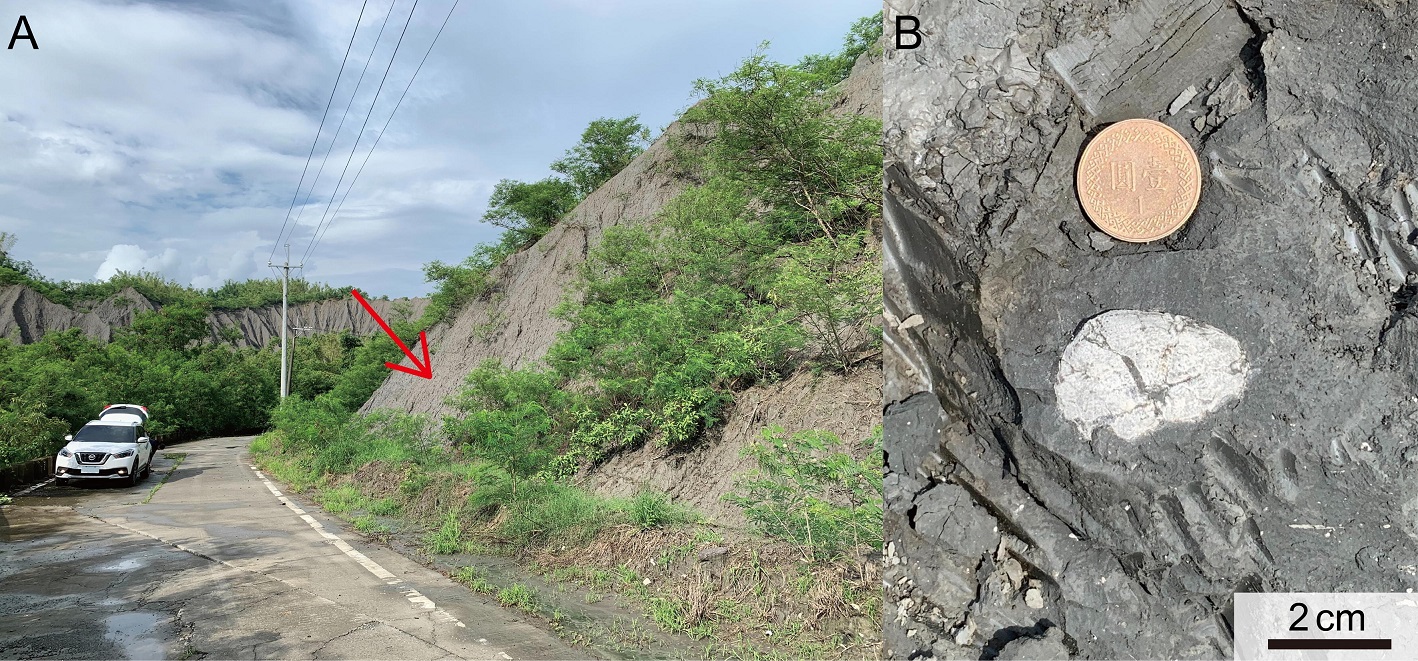 海膽化石出土的露頭,位於高雄田寮距今約一百萬年的古亭坑層。圖片來源:Hsu, C.-H., Lin, J.-P., & Lin, C.-H. (2024)