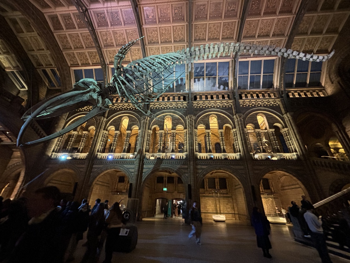 倫敦自然史博物館大廳閉館前打燈的鯨魚骨架,夜晚來臨,遊客逐漸離開。圖片來源:許家昕提供