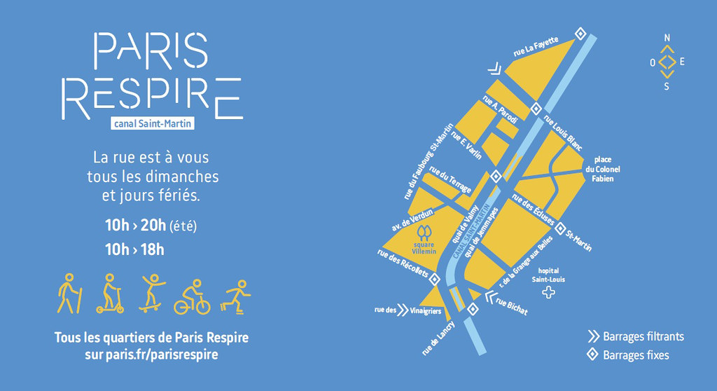 巴黎喘息計畫會於每週日與國定假日封路專供行人、自行車騎士等用路人使用。圖為在巴黎聖馬丁運河附近的宣導圖。照片來源:巴黎市政府
