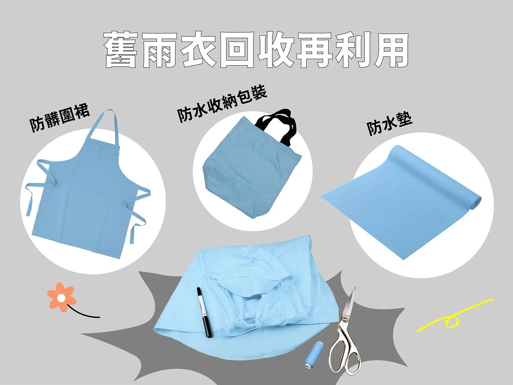 簡單分享完兩種不同類型的雨衣,該怎麼回收丟棄,不過若雨衣還沒有太嚴重破損,其實還有不少方式可以再利用,延長它的使用壽命。以下三種做法,讓退役雨衣再發揮價值: