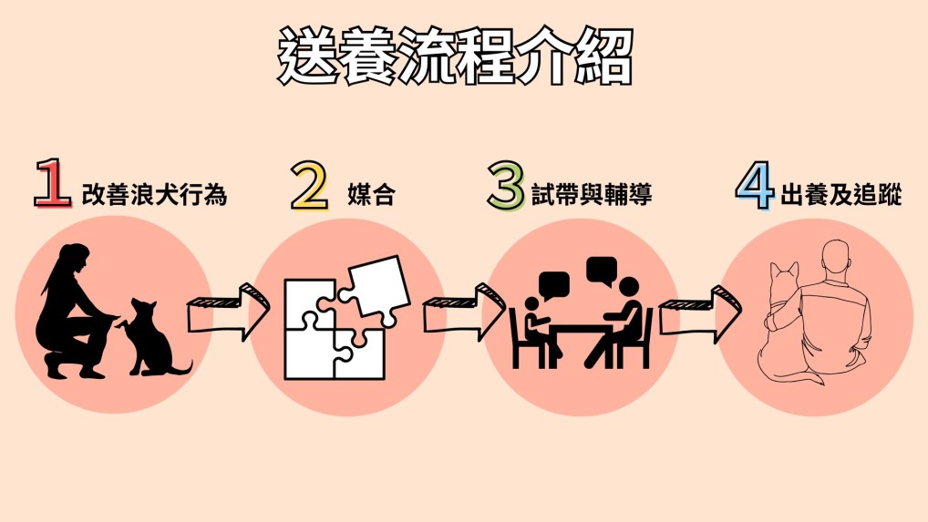 ↑ 攜旺浪浪中途學校的送養流程介紹。製圖/林楷宸