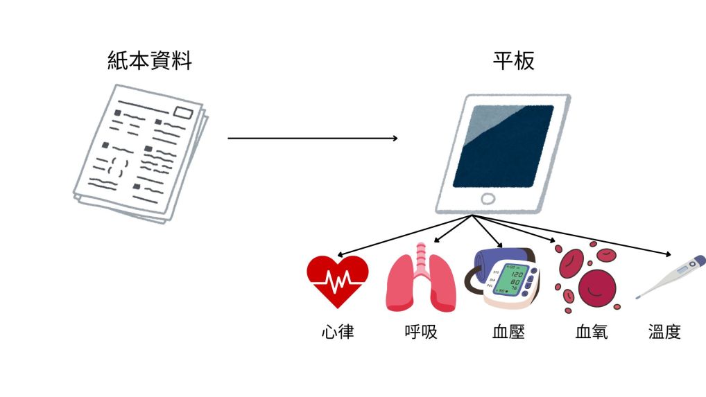 譬如長照機構人員每一天都要幫每位住民量血壓血氧及額溫,遇到特別需要照顧者甚至一天要量三次。在測量完後,護理師需要手寫紀錄數值,一人負責數十張床位,無形中記錄生命徵象的過程就耗費了不少的時間。