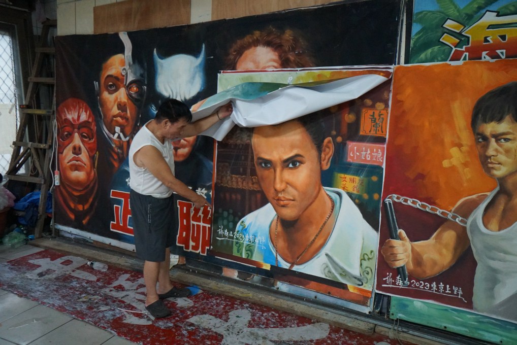 繪畫過程中,他先在公司提供的海報上畫格子、抓比例,接著在巨大的電影版上打出人物的草稿,再一氣呵成地勾勒並上色。卡通電影的看板他一天就能完成,真人電影則需要二到三天才能完工。