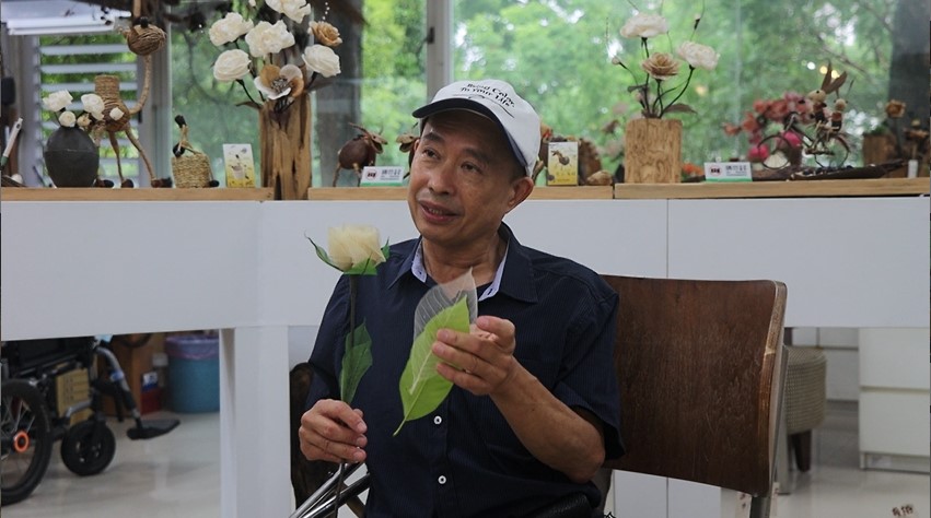 ↑ 李永謨將樹葉重新利用製作成花卉。攝影/康耘誌