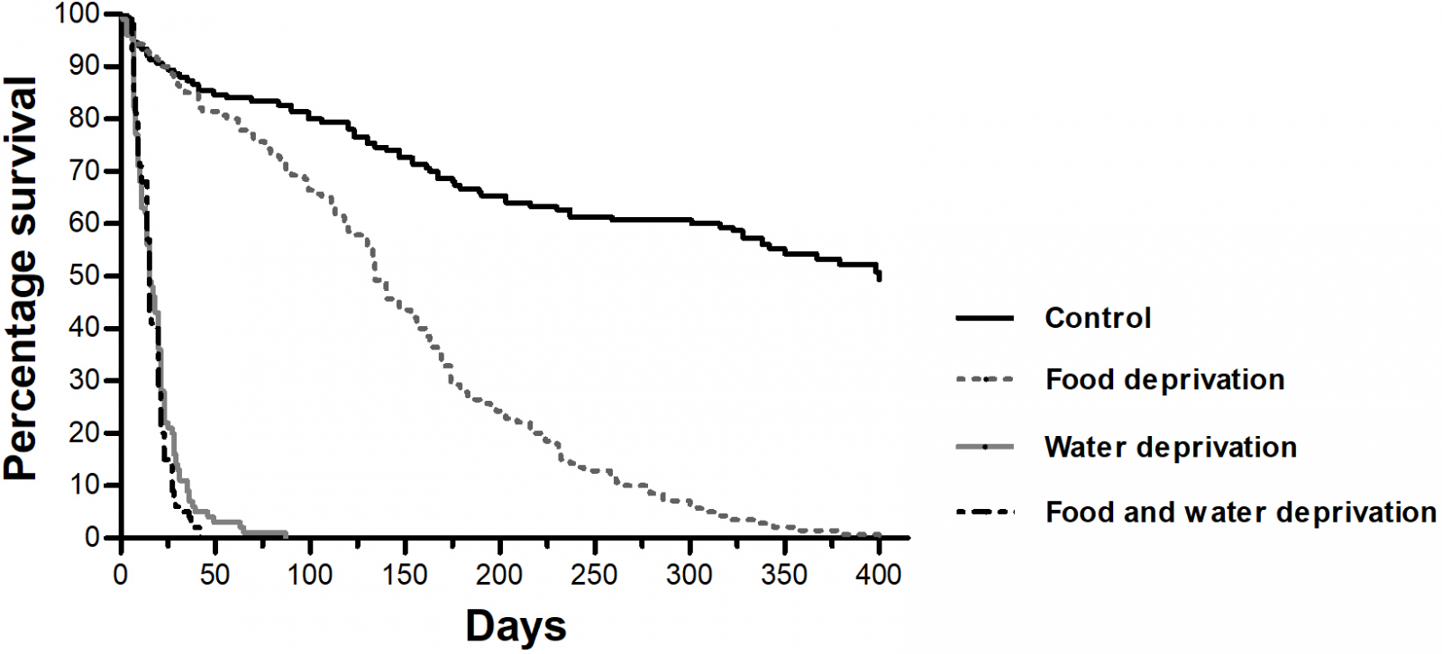 研究團隊分別在不同資源條件下分析巴西黃蠍的存活率分析,發現這種蠍子在沒有食物但有水的情況下,最長可存活400天。照片來源:2019 Pimenta et al.(CC BY 4.0)