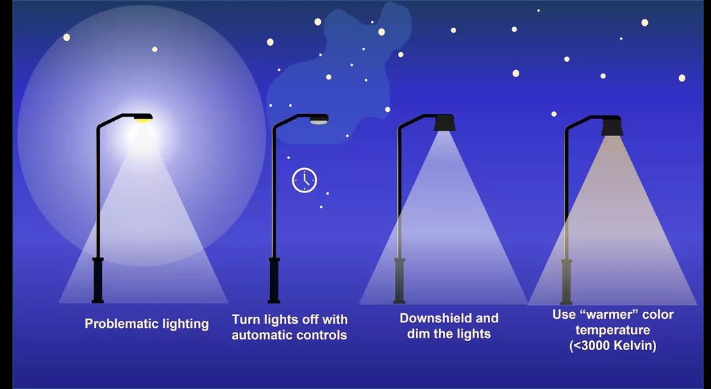 過多的夜間燈光可能影響鳥類活動,圖由左至右分別為,產生大量光污染的光源、以定時或感測器自動關閉的燈光、亮度低並增加燈罩的光線以及暖光。除了第一種以外,後三種方式都能減少對鳥類的影響。照片來源:USFWS
