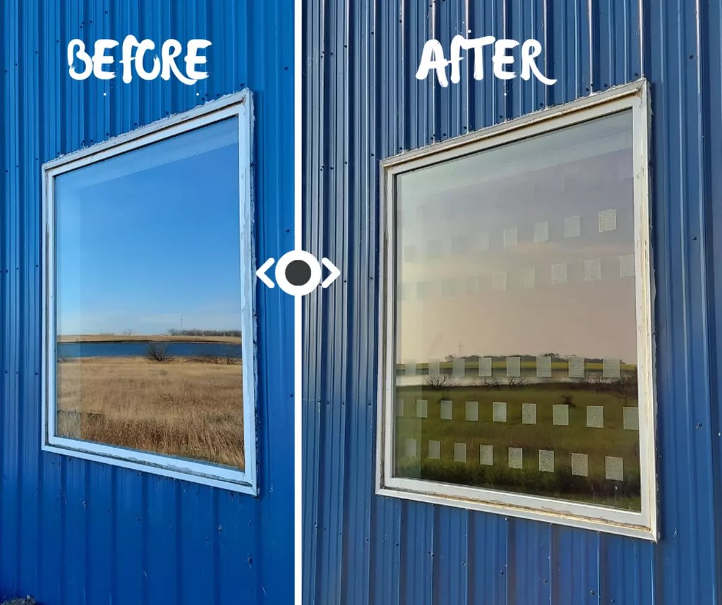 為了讓鳥類容易識別障礙物,可以在玻璃上貼上窗貼。圖為加上窗貼之前與之後的對比照。照片來源:Allison Stewart/USFWS