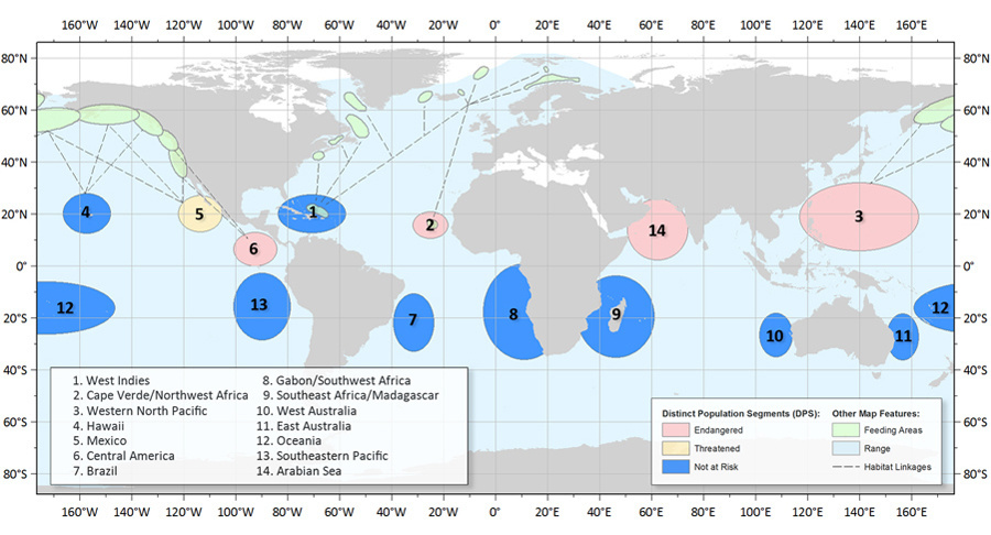 而NOAA根據美國《瀕危物種法》,針對不同區域的大翅鯨保育情況,有分類更細,且更新更為頻繁的資料。NOAA將全球大翅鯨細分為14個獨立族群,其中四個瀕危(Endangered)、一個受脅(Threatened),及九個族群未列入(Not Listed)《瀕危物種法》,意指數量穩定或尚未達保育標準。