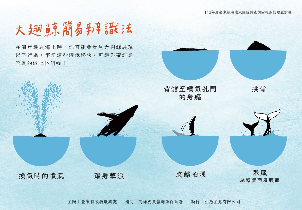 大翅鯨簡易辨識法,別忘了最後要拍下尾鰭,才有機會知道更多大翅鯨的個別資訊。圖片來源:台東縣政府