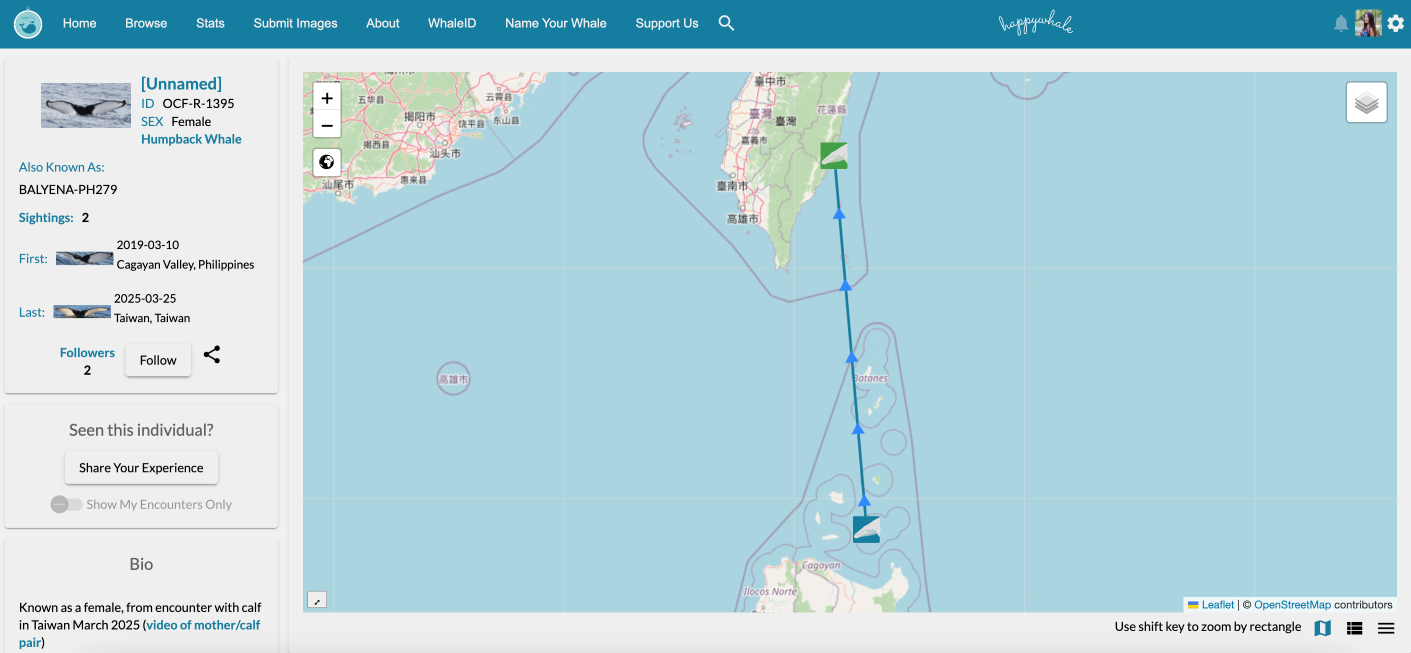 返航後,Orca將拍到的母鯨尾鰭,上傳到全球大翅鯨Photo-ID資料最完整的公民科學網站「Happy Whale」(快樂鯨魚),三天就收到比對結果,這隻母鯨(ID:BALYENA-PH279)在2019年就曾於菲律賓繁殖區巴布延海域被記錄。