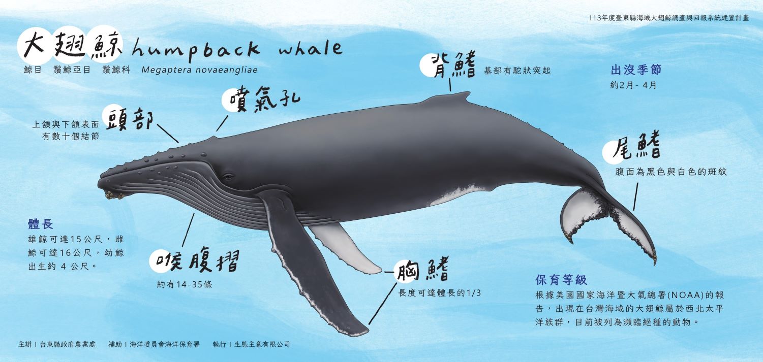 台東縣政府近年推出大翅鯨海洋保育教育推廣計畫,展開調查、目擊回報、志工訓練與教育推廣活動。圖片來源:台東縣政府