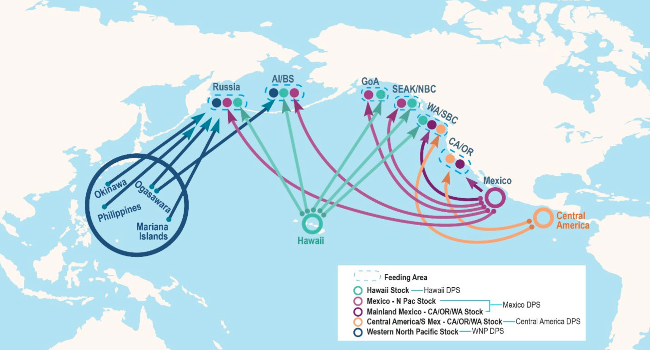 出現在台灣周邊海域的大翅鯨,屬於西北太平洋族群(Western North Pacific, WNP stock),目前被NOAA列為「瀕危」等級。這個族群主要的繁殖區位於菲律賓的巴布延群島(Babuyan Islands)與日本沖繩群島周邊,夏季則會洄游到俄羅斯高緯度海域覓食。