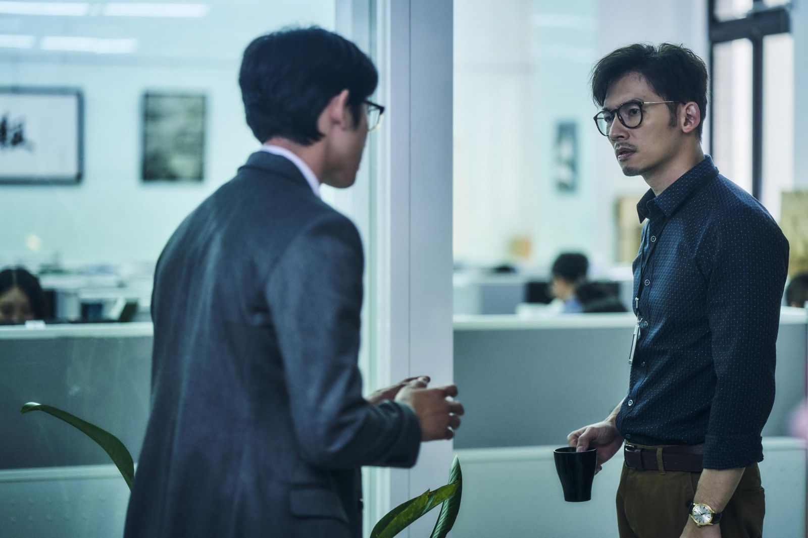 《我們與惡的距離》劇照,右為網路先驅報創辦人劉昭國,由溫昇豪飾演。(照片提供/大慕影藝)