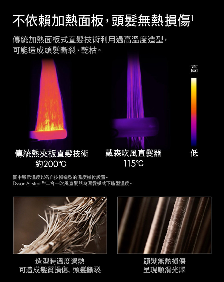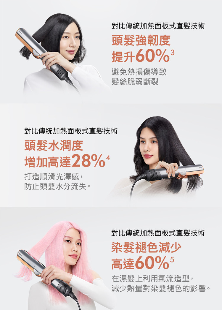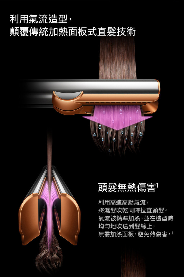 乾濕兩用省時省心:不依賴加熱面板,無熱傷害: 傳統加熱式直髮器,利用高溫造型易造成頭髮斷裂乾枯。Dyson二合一吹風直髮器,提升髮絲強韌度60% / 水潤度28%/ 染髮退色60%
