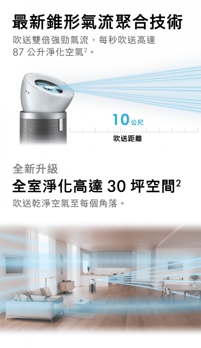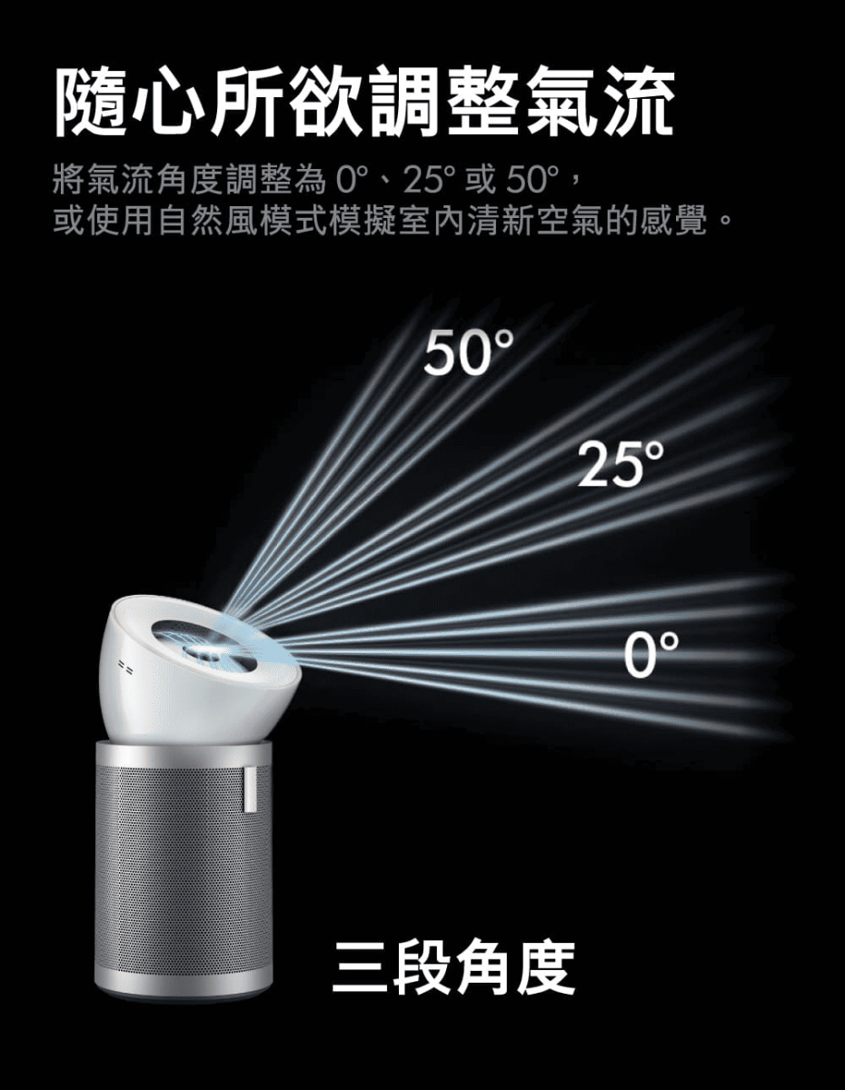 強勁—吹送氣流超過10公尺:捕捉遠處的污染物,以淨化高達 30 坪空間。流線型可調節風管,能在最大風速下控制風向和強度。