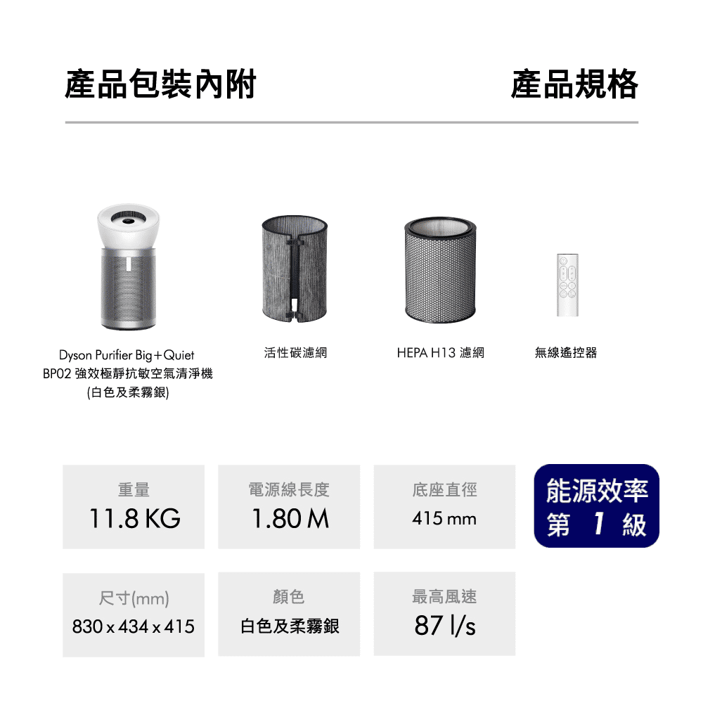 品名 "Dyson Purifier Big+Quiet 強效極靜抗敏空氣清淨機 白色及柔霧銀