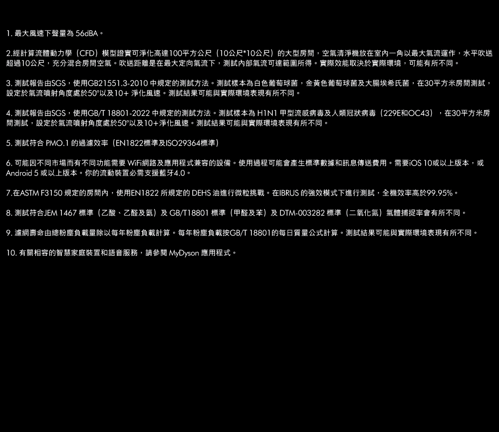 2. 經計算流體動力學(CFD)模型經證實可淨化高達 100 平方公尺(10 公尺* 10 公尺)的大型房間,空氣清淨機放在室內一角,以最大氣流運作,水平吹送超過 10 公尺,充分混合房間空氣。吹送距離是在最大定向氣流下,測試內部氣流可達範圍所得。實際效能取決於實際環境,可能有所不同。