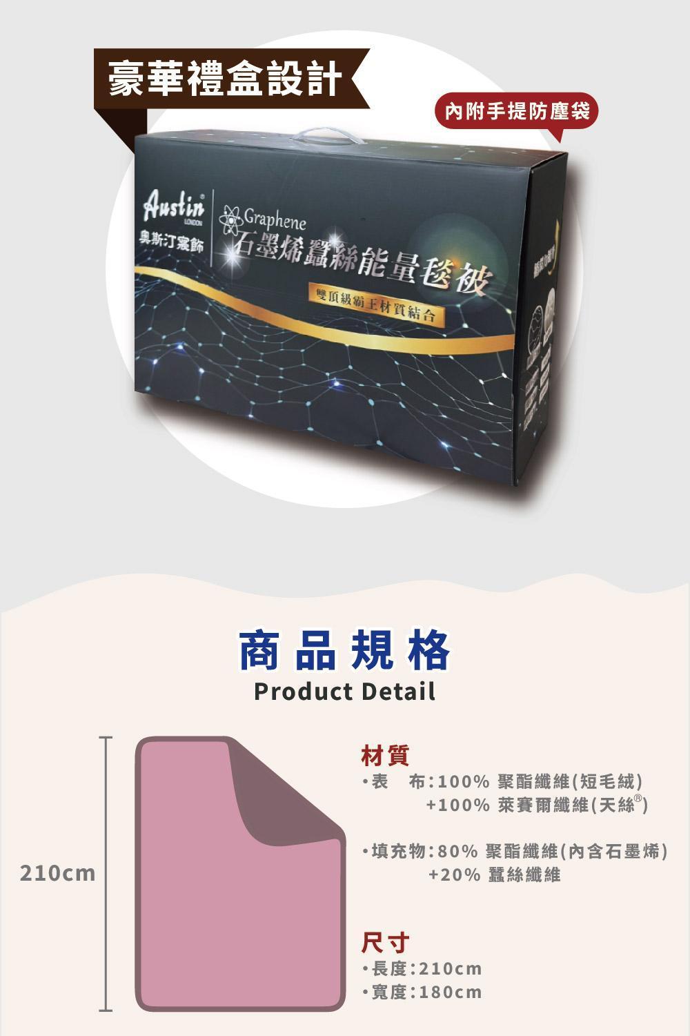 商品詳情 • 結合石墨烯與蠶絲纖維,提供卓越的導熱與透氣性能 • 遠紅外線釋放,促進血液循環,跟忽冷忽熱說再見 • 短毛絨與萊賽爾天絲纖維,雙面親膚設計,貼合肌膚,提升舒適度 • 豪華禮盒包裝,送禮體面,自用療癒,每一刻都充滿儀式感 【Austin Home 奧斯汀寢飾】石墨烯蠶絲能量四季毯被(黃) TWD $7,200 TWD $7,200