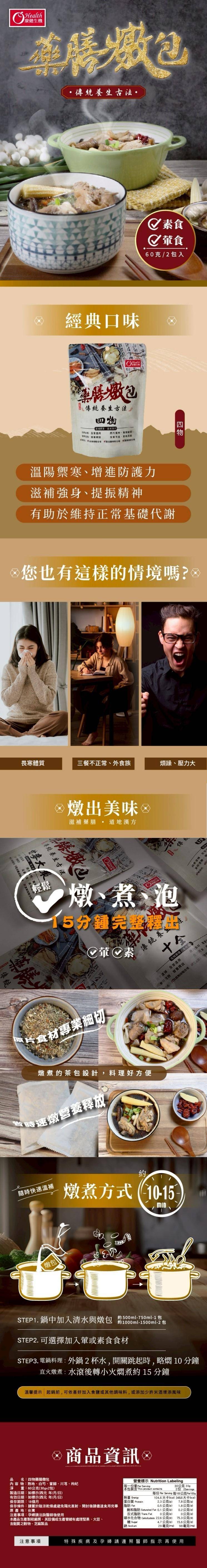 我喜歡加幾塊排骨或雞腿一起燉煮,肉質吸滿了四物的精華,湯頭鮮甜回甘。如果你是蔬食愛好者,這款燉包更是全素可食,加入木耳、菇類或豆包,一樣能燉出一鍋層次豐富的養生湯底。